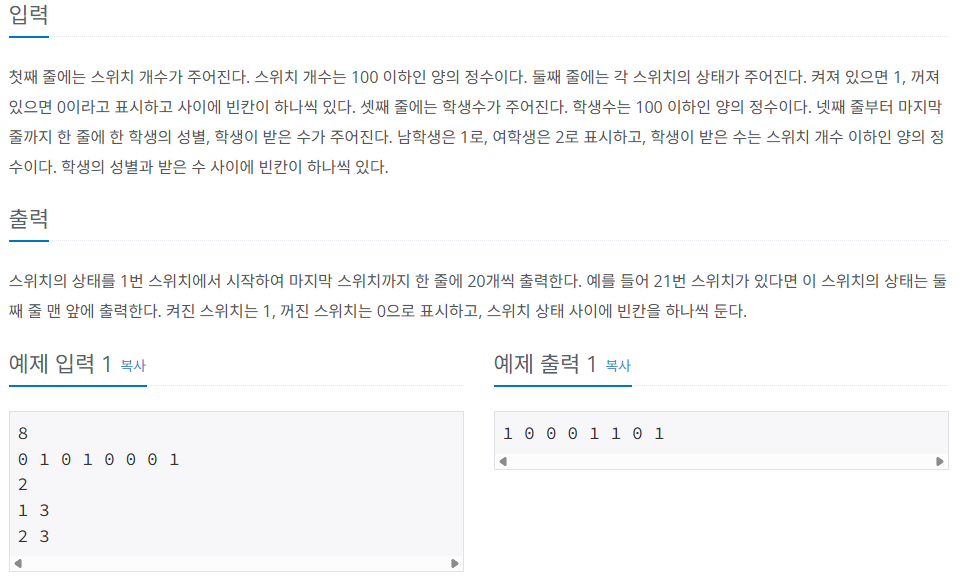 남학생 -> 스위치 번호가 받은 수의 배수인 것만 상태 바꿈
