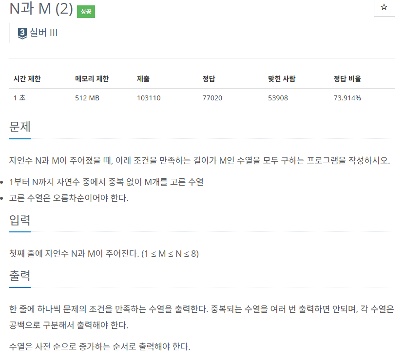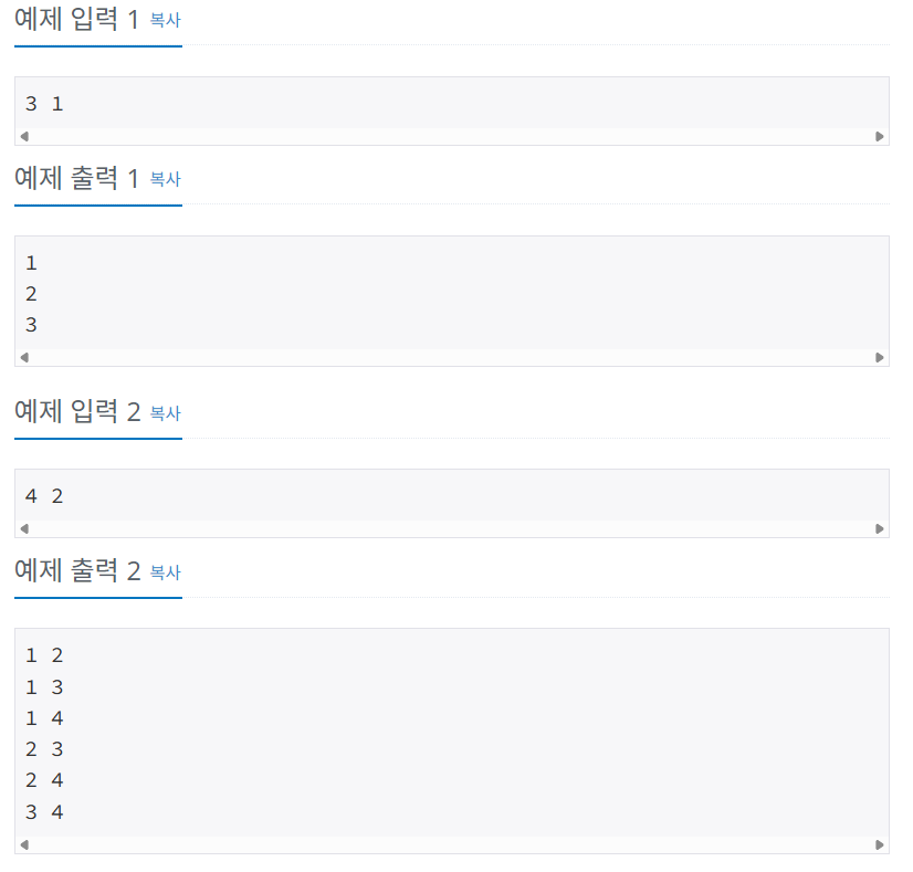 N과 M (1)과 비슷하지만 조합을 사용해야 하는 문제이다