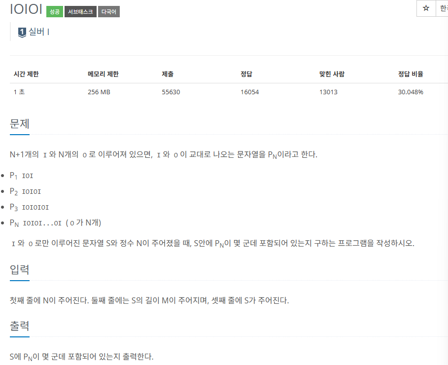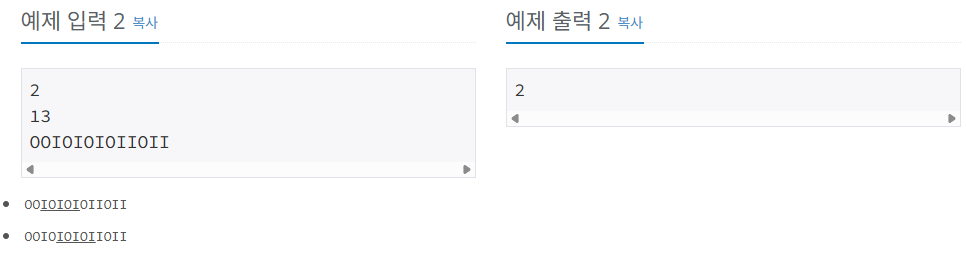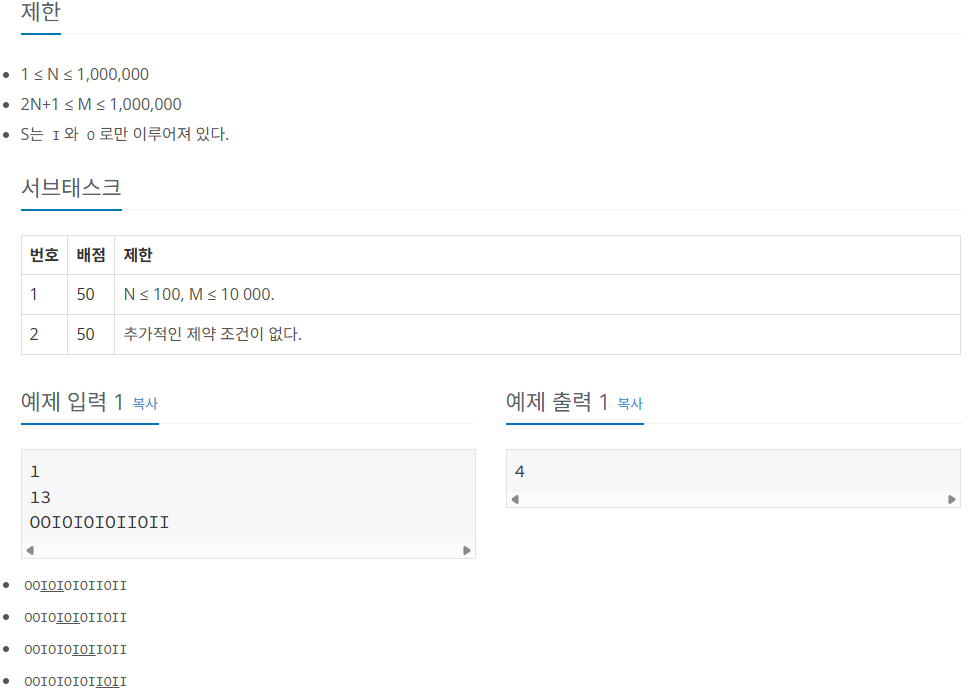 이 점을 활용해서 전체 문자열을 한번만 순회하면서 IOI가 연속으로 몇 번 나오는지를 세는 것이 핵심이다