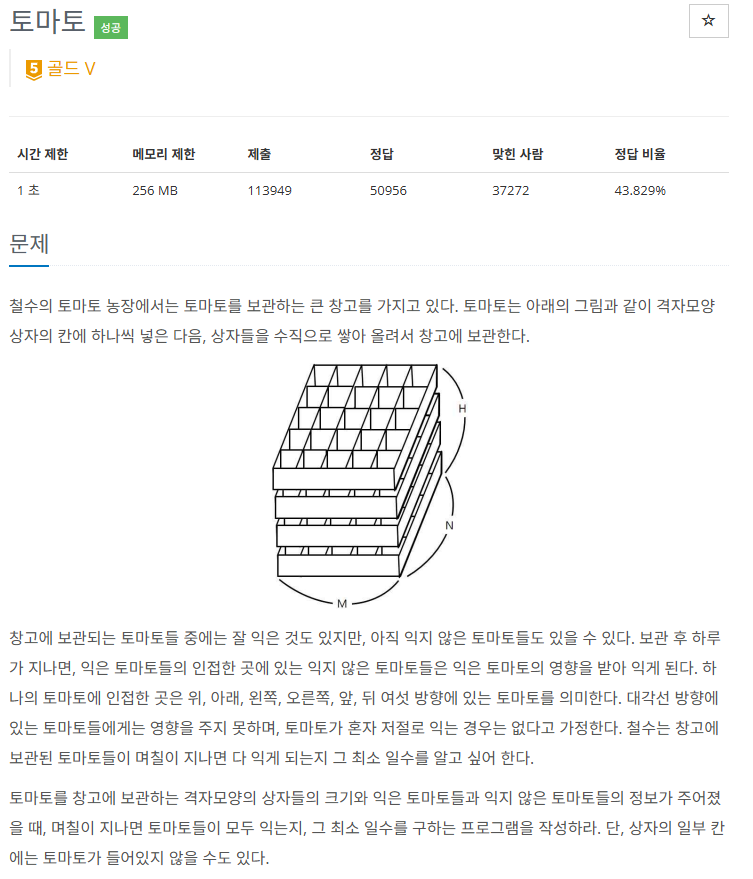 익은 토마토는 하루가 지나면 상하좌우앞뒤의 익지 않은 토마토를 익게한다