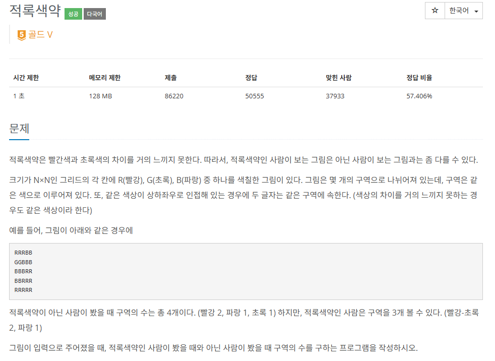 적록색약인 사람의 경우에는 배열 값이 G가 나왔을 때 R로 바꿔주어 같은 구역으로 만들고 bfs를 돌리면 된다