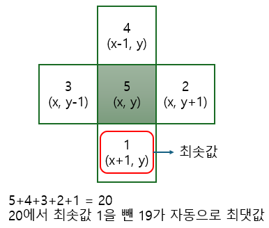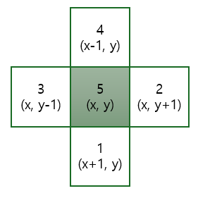 (x, y)를 중심으로 하는 상하좌우 십자 모양을 탐색하고