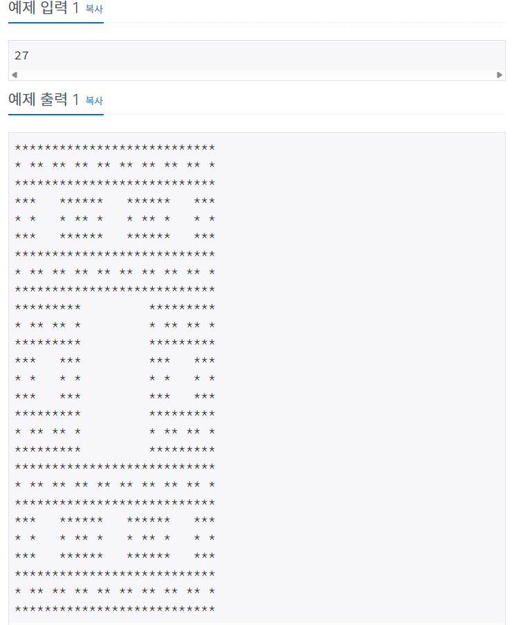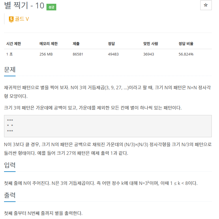 주어진 크기 N에 대해 재귀적인 규칙에 따라 가운데가 비어있는 패턴을 그리는 문제이다