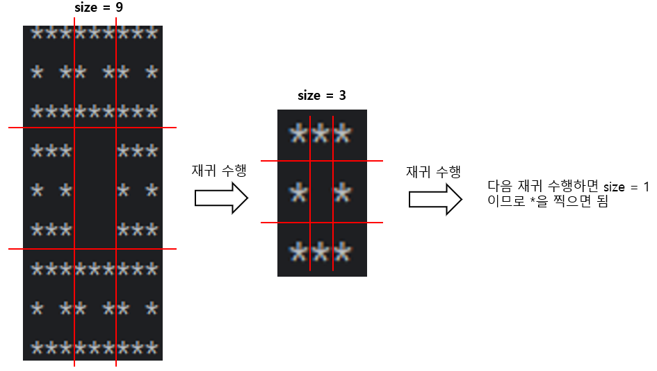 - 나머지 8칸에서는 새로운 시작 좌표와 newSize를 인자로 넘겨 재귀 함수를 호출